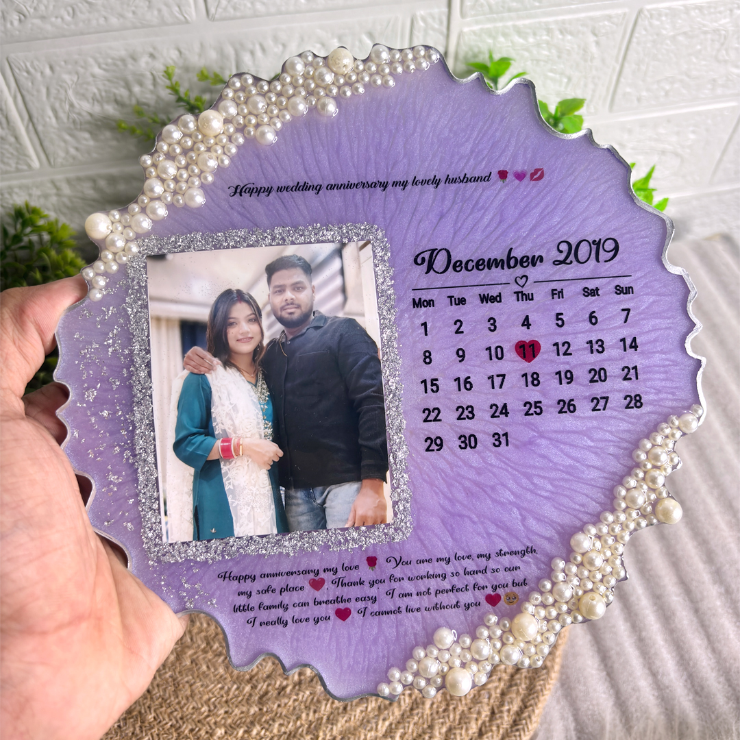 A beautifully handcrafted keepsake that captures meaningful dates in a unique way. Featuring an elegant calendar design embedded in high-quality resin, this frame is adorned with delicate moti (pearls) for a touch of sophistication. Personalize it with your special date, names, or a heartfelt message to create a one-of-a-kind memento. Perfect for anniversaries, weddings, birthdays, or any memorable occasion, this frame adds a timeless charm to your home décor. Celebrate love, milestones, and memories with this exquisite resin art frame, designed to last a lifetime.