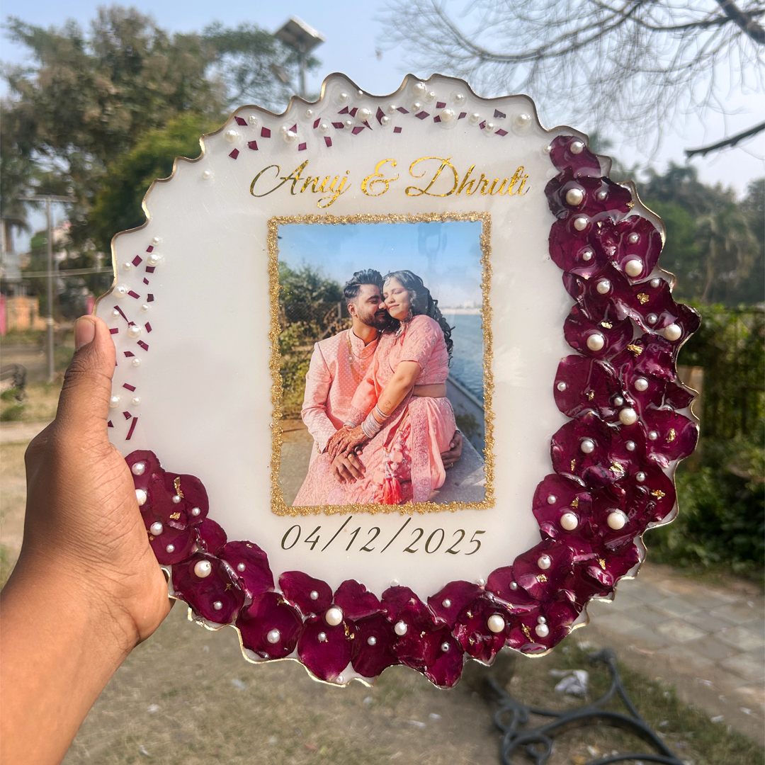 Celebrate timeless love with this handcrafted resin art frame that radiates elegance and romance. Designed with deep maroon floral petals, delicate pearls, and shimmering gold accents, it beautifully preserves your most cherished memories. Personalize it with names, a special date, or a heartfelt message to make it truly one-of-a-kind. The Royal Bloom Resin Art Frame brings luxury and warmth to any space, making it an ideal keepsake for anniversaries, engagements, or weddings. Add a royal touch to your décor while capturing the beauty of togetherness in every detail.
